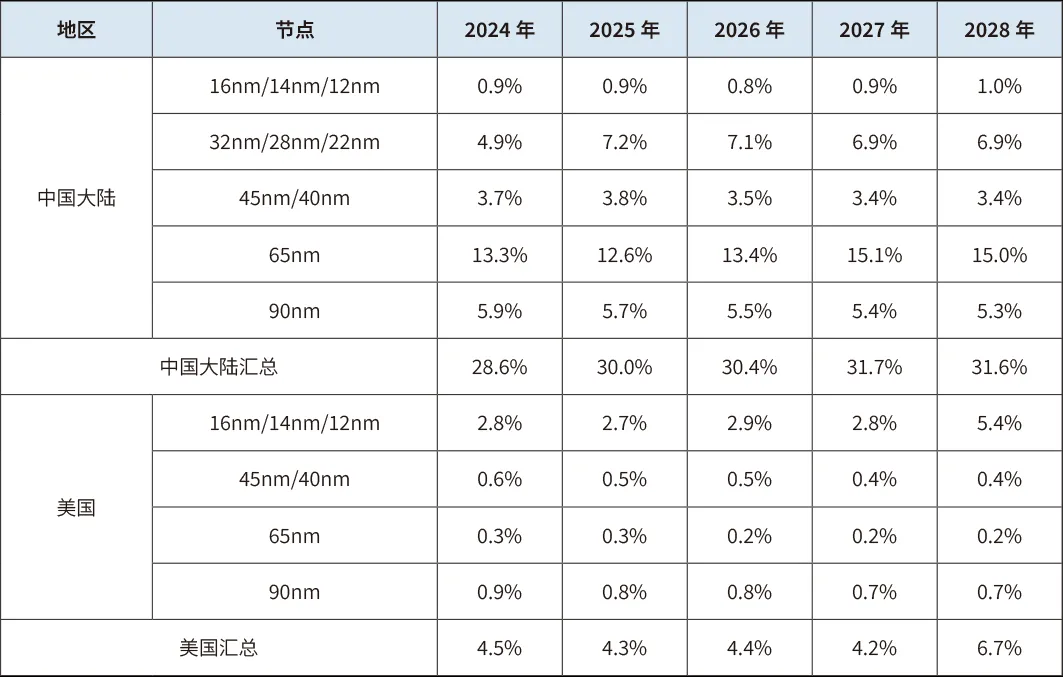 表5 2024年中美及中國(guó)臺(tái)灣各集成電路代工企業(yè)12寸代工產(chǎn)能占比