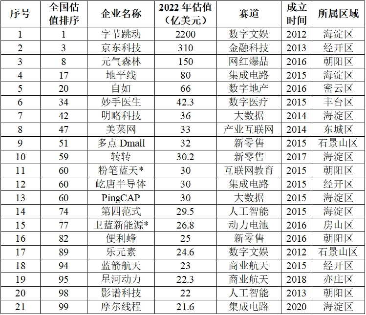 表1 2022年全國估值前100的北京獨角獸企業(yè)