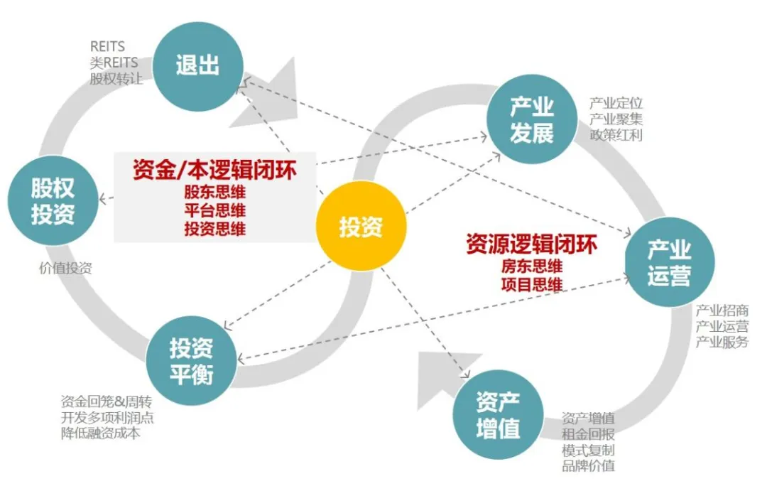 產業地產并不是產業+地產的簡單組合,而是具有豐富邏輯內涵的特色經濟形式。在實際投資實踐中,要不斷優化商業模式,擴充收益點,控制融資成本,把握生命線,通過土地資產化、資產資本化、資本證券化的邏輯循環,搭建資金/資本的邏輯閉環;同時,產業主導決定了產業集聚的可行性與投資退出的一致性,專業運營決定了現金流回流的可預期性以及最后資產不良的可能性,通過產業服務和運營促進產業集聚資產增值實現退出,搭建產業資源的邏輯閉環。