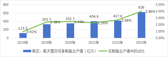 圖1  近5年北京航空、航天器及設備制造業產值及占比情況